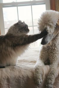 …ci sono barboni che vivono pacificamente con i gatti. Se il rapporto si sviluppa da cuccioli e se si fa attenzione che il gatto abbia la possibilità di defilarsi quando si stufa del cane, le probabilità di successo sono maggiori.